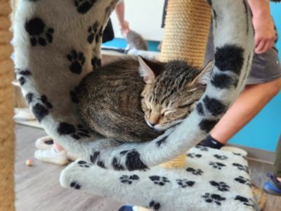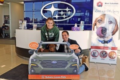 The West Suburban Humane Society (WSHS) has partnered with Gerald Subaru of Naperville since 2015, and it's not surprising that Subaru has become one of WSHS's largest partners. The year's biggest collaboration is our October month-long "Subaru Loves Pets" promotion, which included our October 21st Adoption event at Gerald Subaru of Naperville (2379 Aurora Ave, Naperville, IL 60540). Our month-long promotion included a 'spin-the-wheel' for an adoption discount, special giveaways all month, and the event at Subaru. In total, we adopted 57 animals in October 2023, a 15% increase over October 2022 and our highest October adoption level since 2015. Dozens of people visited our animals at the adoption event (we distributed more than 30 giveaway bags to families!), and both staff and visitors loved meeting our animals. Our first visitors of the day were Natalia Boettcher and her husband Kyle Cepeda, who had seen our promotions about Yoshi, a 3-year-old lab-retriever mix. Natalia tells us "We were so excited to meet Yoshi after seeing him on the WSHS website and social media, and felt like he would be a great fit for our family. We wanted to be the first to meet him so we made sure to arrive as soon as the event started. The WSHS team was extremely helpful in introducing us to Yoshi, letting us spend some quality time with him, and answering all our questions. We also received some adoption goodies from the kind folks at Gerald Subaru, and Yoshi was especially excited about the toys! Yoshi has been adjusting well to life in his new home. He is a goofy boy that loves playing tug-of-war and napping on the couch. The WSHS counselors told us he is highly food motivated, and we've seen that first hand with how excited he is for treats! We are grateful to have him join our family."