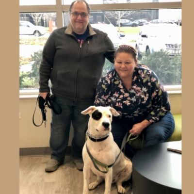 Kathy and Ed were out running errands last October when they noticed the signs for our adoption event at Gerald Subaru of Naperville. Kathy said, "We have to stop in!" Their dog had passed away a few years ago, and they had been thinking about another dog, but never took action, until fate led them to our event. They fell in love with Avi, a bully mix, at first sight! However, they were planning a trip and were unable to make a commitment to him when they were leaving right away. Kathy loved him so much that she even sent a picture to her brother to see if he would adopt him. Avi was always on their mind - they knew he would be a perfect fit for their family! A week or so after their trip, they came to our adoption center to start the paperwork to bring him home. Kathy says that he is a 'big lap dog', who sits between them on the couch so that they can both pet him and cuddle with him, and nudges them to 'keep going' if they stop. During the day he sleeps on the bed near Kathy while she works from home, always keeping a watchful eye on his mom. We are so grateful to Gerald Subaru of Napervile for all of their support of our animals, in October and all year long!
